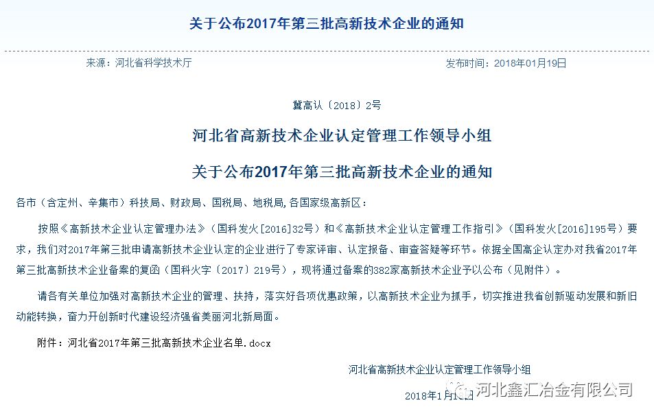 2018119日,經河北省高新技術企業認定管理辦公室組織專家評審、公示等程序后,我公司順利通過國家高新技術企業認定,成為高新技術企業。